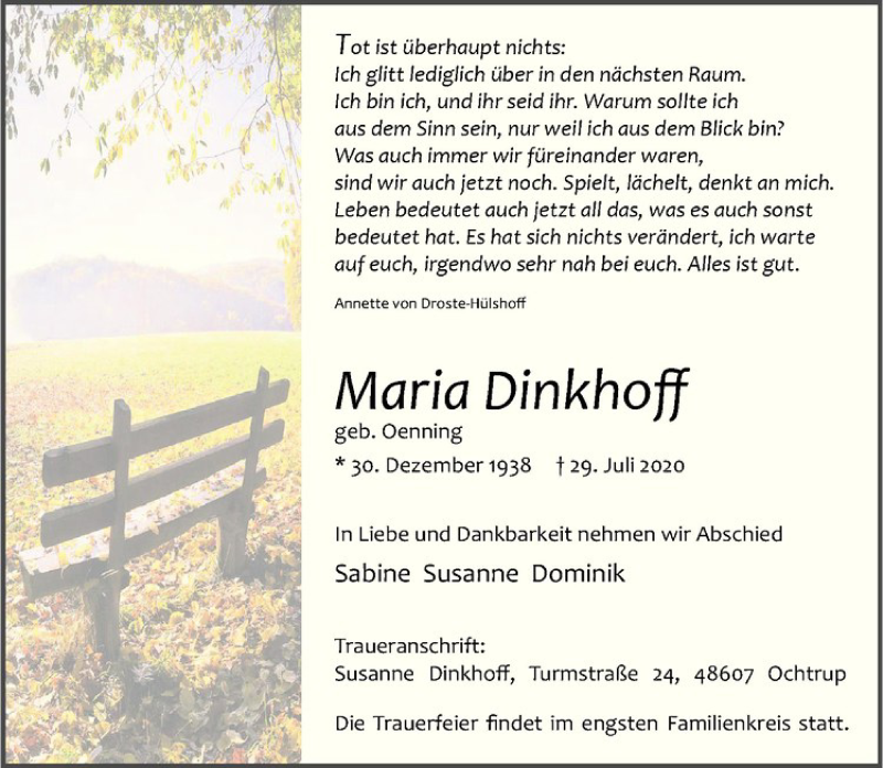 Hier finden Sie alle Traueranzeigen aus der Zeitung, die bisher für Maria Dinkhoff erschienen sind. Weitere Traueranzeigen, die in der Zeitung erscheinen, werden hier ebenfalls aufgelistet