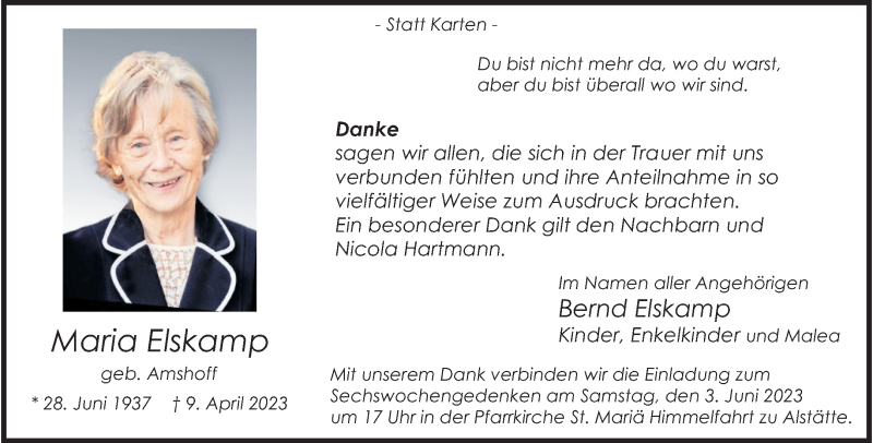 Hier finden Sie alle Traueranzeigen aus der Zeitung, die bisher für Maria Elskamp erschienen sind. Weitere Traueranzeigen, die in der Zeitung erscheinen, werden hier ebenfalls aufgelistet