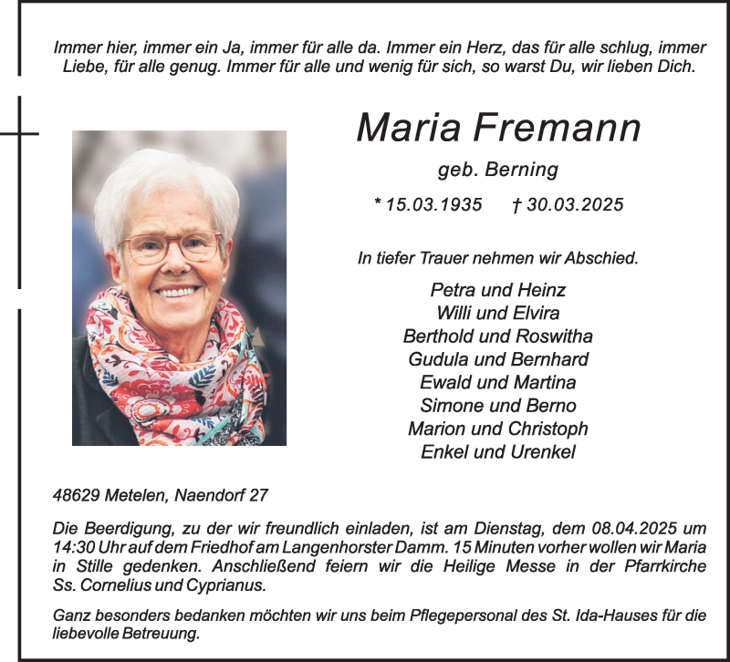 Hier finden Sie alle Traueranzeigen aus der Zeitung, die bisher für Maria Fremann erschienen sind. Weitere Traueranzeigen, die in der Zeitung erscheinen, werden hier ebenfalls aufgelistet