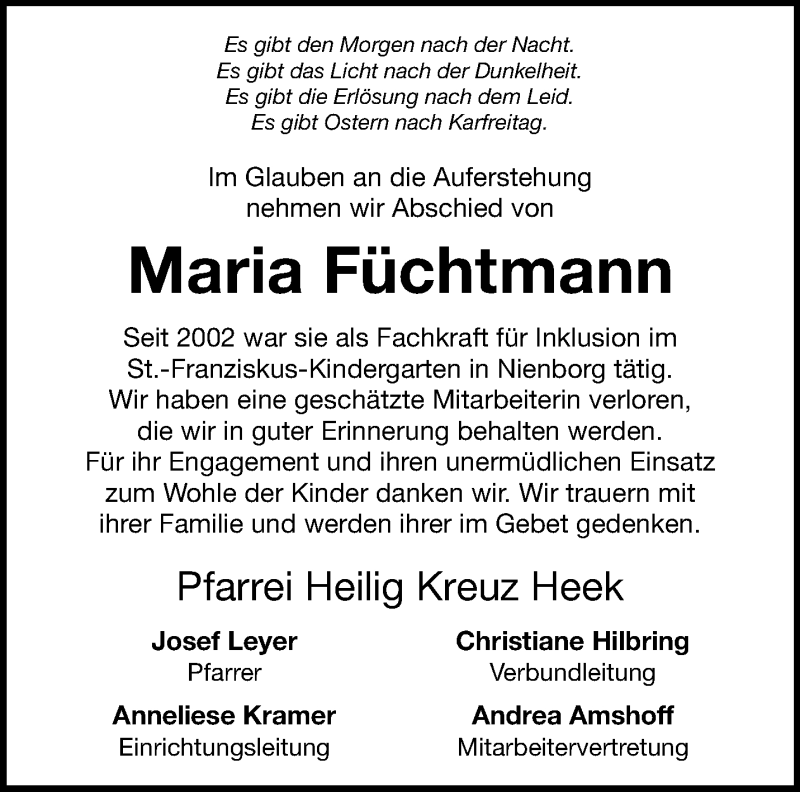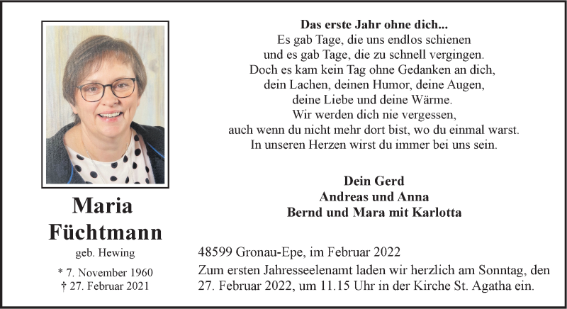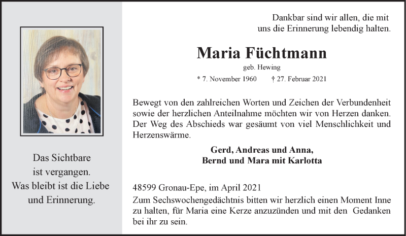 Hier finden Sie alle Traueranzeigen aus der Zeitung, die bisher für Maria Füchtmann erschienen sind. Weitere Traueranzeigen, die in der Zeitung erscheinen, werden hier ebenfalls aufgelistet
