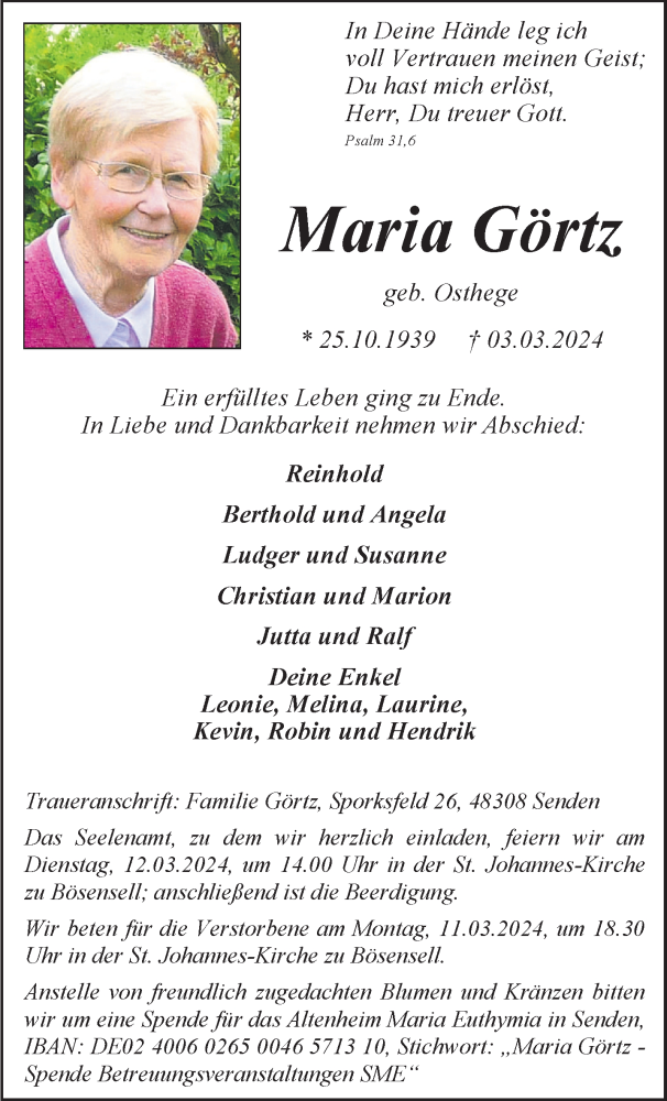 Hier finden Sie alle Traueranzeigen aus der Zeitung, die bisher für Maria Görtz erschienen sind. Weitere Traueranzeigen, die in der Zeitung erscheinen, werden hier ebenfalls aufgelistet
