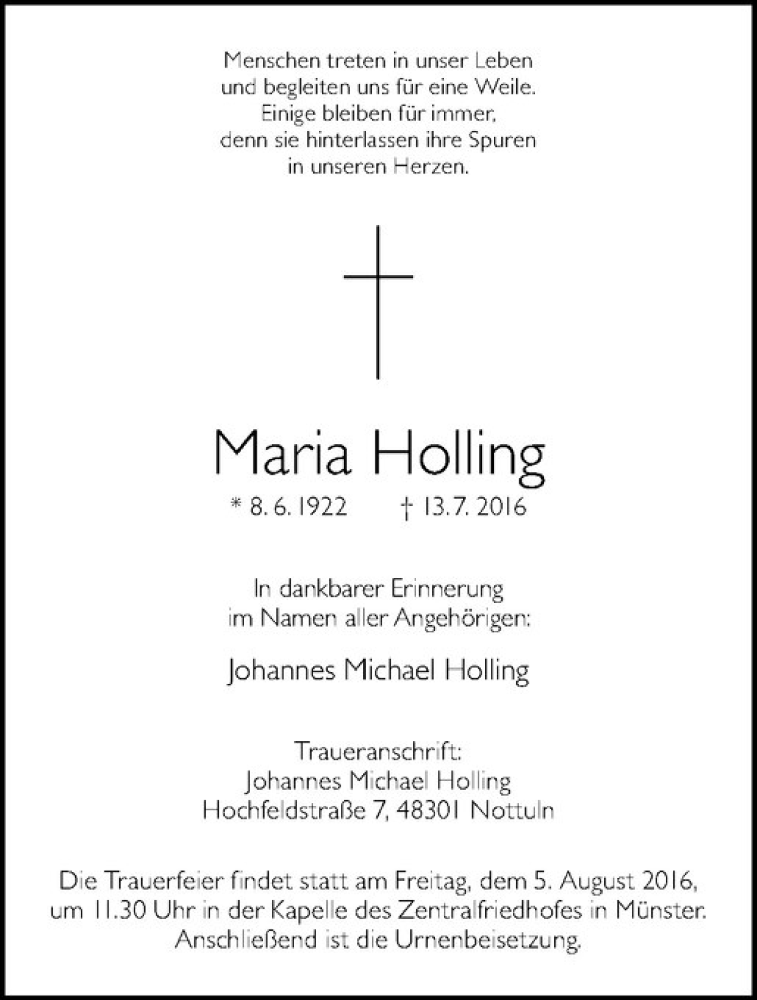 Hier finden Sie alle Traueranzeigen aus der Zeitung, die bisher für Maria Holling erschienen sind. Weitere Traueranzeigen, die in der Zeitung erscheinen, werden hier ebenfalls aufgelistet