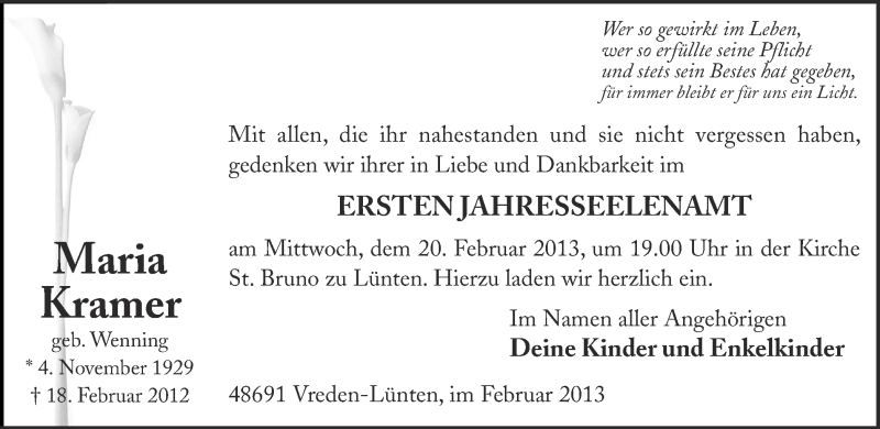 Hier finden Sie alle Traueranzeigen aus der Zeitung, die bisher für Maria Kramer erschienen sind. Weitere Traueranzeigen, die in der Zeitung erscheinen, werden hier ebenfalls aufgelistet