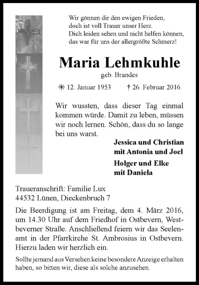 Hier finden Sie alle Traueranzeigen aus der Zeitung, die bisher für Maria Lehmkuhle erschienen sind. Weitere Traueranzeigen, die in der Zeitung erscheinen, werden hier ebenfalls aufgelistet