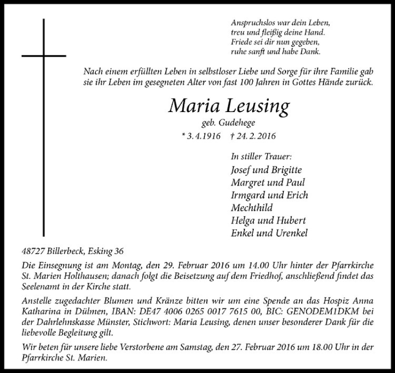 Hier finden Sie alle Traueranzeigen aus der Zeitung, die bisher für Maria Leusing erschienen sind. Weitere Traueranzeigen, die in der Zeitung erscheinen, werden hier ebenfalls aufgelistet