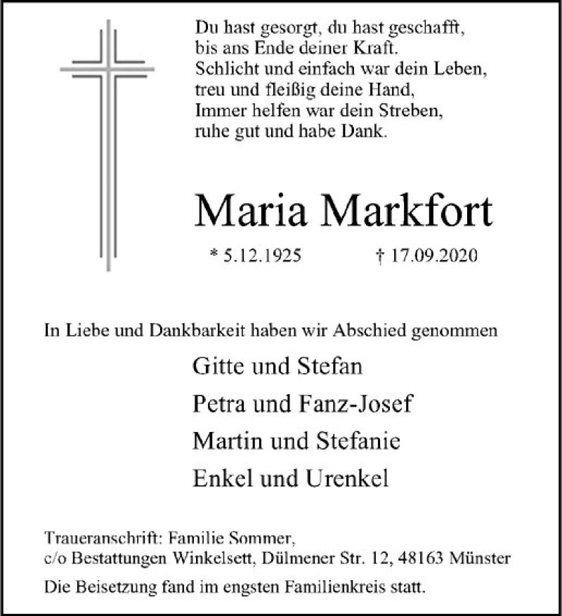 Hier finden Sie alle Traueranzeigen aus der Zeitung, die bisher für Maria Markfort erschienen sind. Weitere Traueranzeigen, die in der Zeitung erscheinen, werden hier ebenfalls aufgelistet