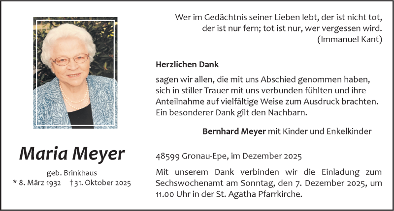 Hier finden Sie alle Traueranzeigen aus der Zeitung, die bisher für Maria Meyer erschienen sind. Weitere Traueranzeigen, die in der Zeitung erscheinen, werden hier ebenfalls aufgelistet