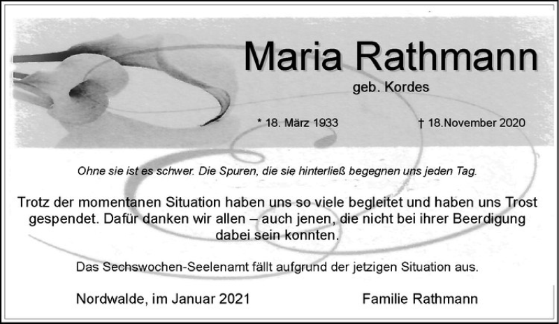 Hier finden Sie alle Traueranzeigen aus der Zeitung, die bisher für Maria Rathmann erschienen sind. Weitere Traueranzeigen, die in der Zeitung erscheinen, werden hier ebenfalls aufgelistet