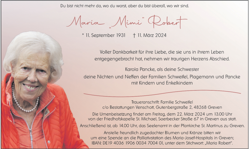 Hier finden Sie alle Traueranzeigen aus der Zeitung, die bisher für Maria Robert erschienen sind. Weitere Traueranzeigen, die in der Zeitung erscheinen, werden hier ebenfalls aufgelistet