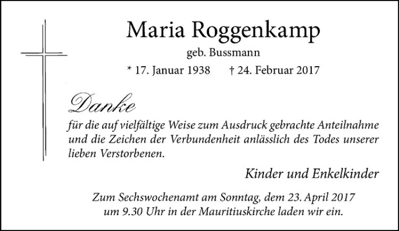 Hier finden Sie alle Traueranzeigen aus der Zeitung, die bisher für Maria Roggenkamp erschienen sind. Weitere Traueranzeigen, die in der Zeitung erscheinen, werden hier ebenfalls aufgelistet