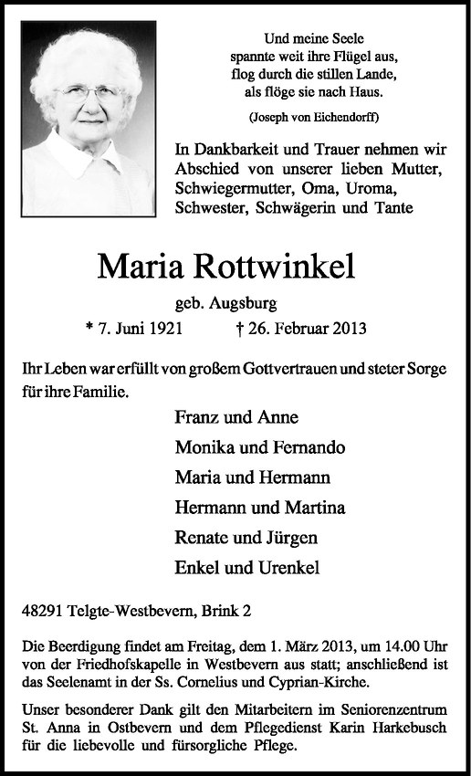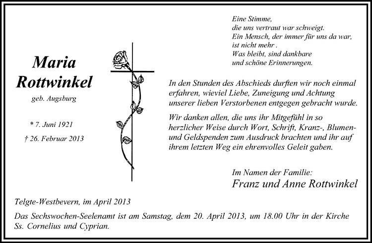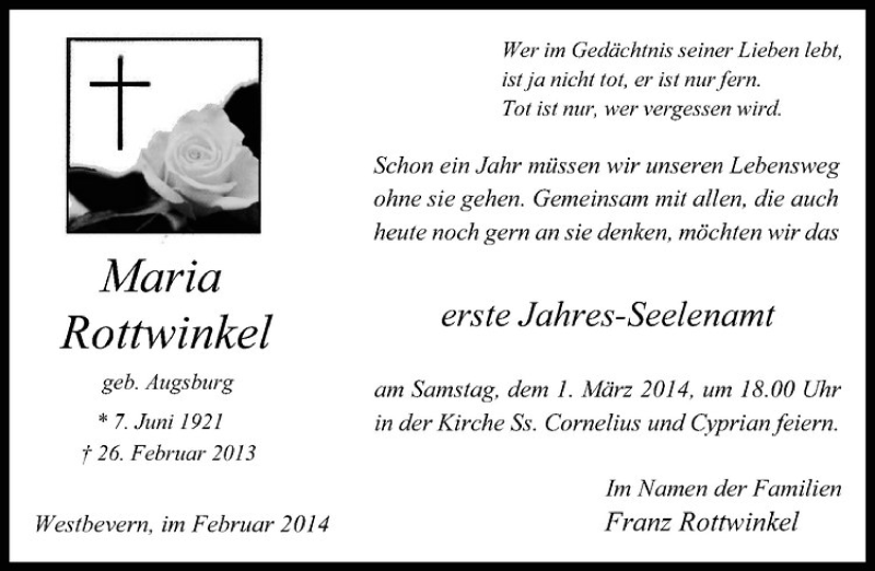 Hier finden Sie alle Traueranzeigen aus der Zeitung, die bisher für Maria Rottwinkel erschienen sind. Weitere Traueranzeigen, die in der Zeitung erscheinen, werden hier ebenfalls aufgelistet