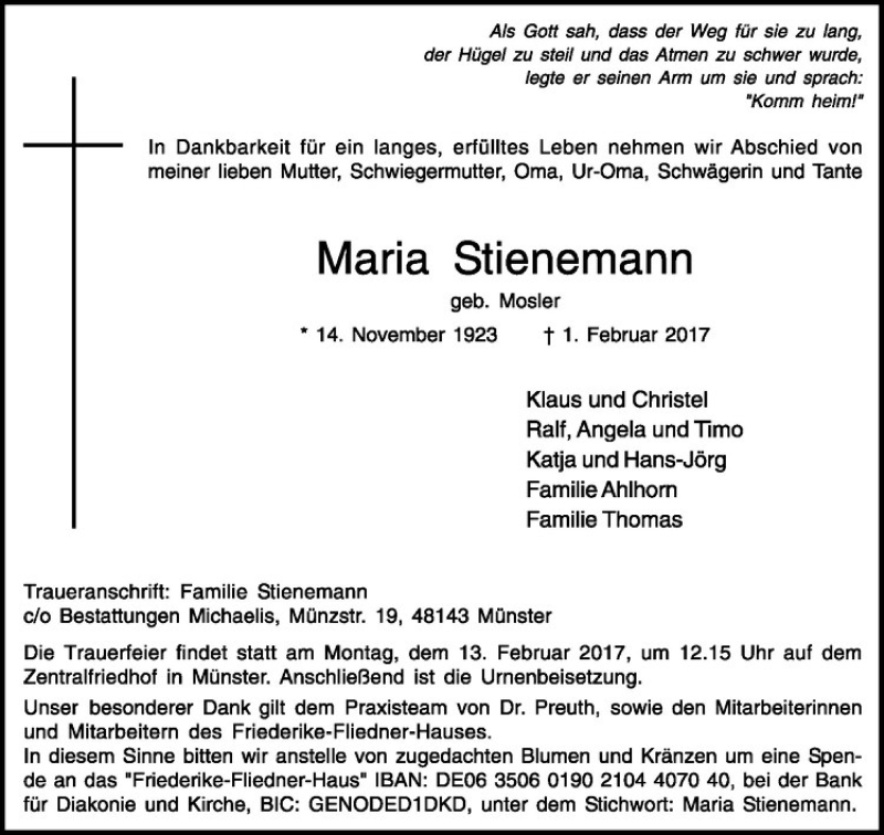 Hier finden Sie alle Traueranzeigen aus der Zeitung, die bisher für Maria Stienemann erschienen sind. Weitere Traueranzeigen, die in der Zeitung erscheinen, werden hier ebenfalls aufgelistet