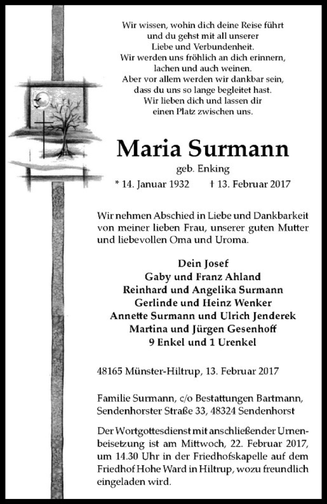 Hier finden Sie alle Traueranzeigen aus der Zeitung, die bisher für Maria Surmann erschienen sind. Weitere Traueranzeigen, die in der Zeitung erscheinen, werden hier ebenfalls aufgelistet