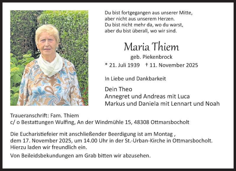 Hier finden Sie alle Traueranzeigen aus der Zeitung, die bisher für Maria Thiem erschienen sind. Weitere Traueranzeigen, die in der Zeitung erscheinen, werden hier ebenfalls aufgelistet