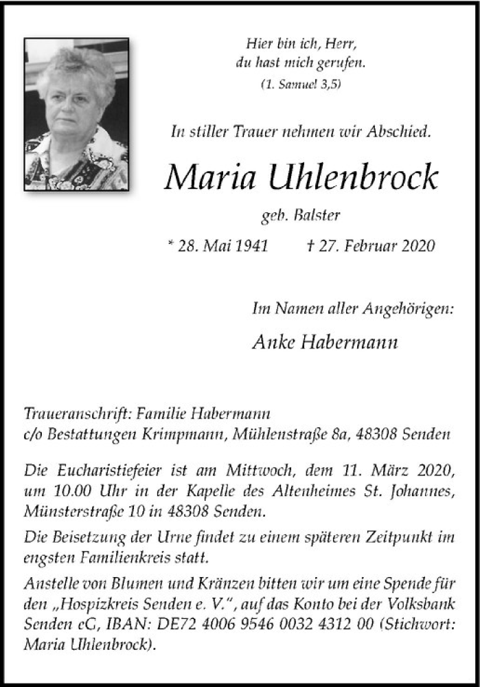 Hier finden Sie alle Traueranzeigen aus der Zeitung, die bisher für Maria Uhlenbrock erschienen sind. Weitere Traueranzeigen, die in der Zeitung erscheinen, werden hier ebenfalls aufgelistet
