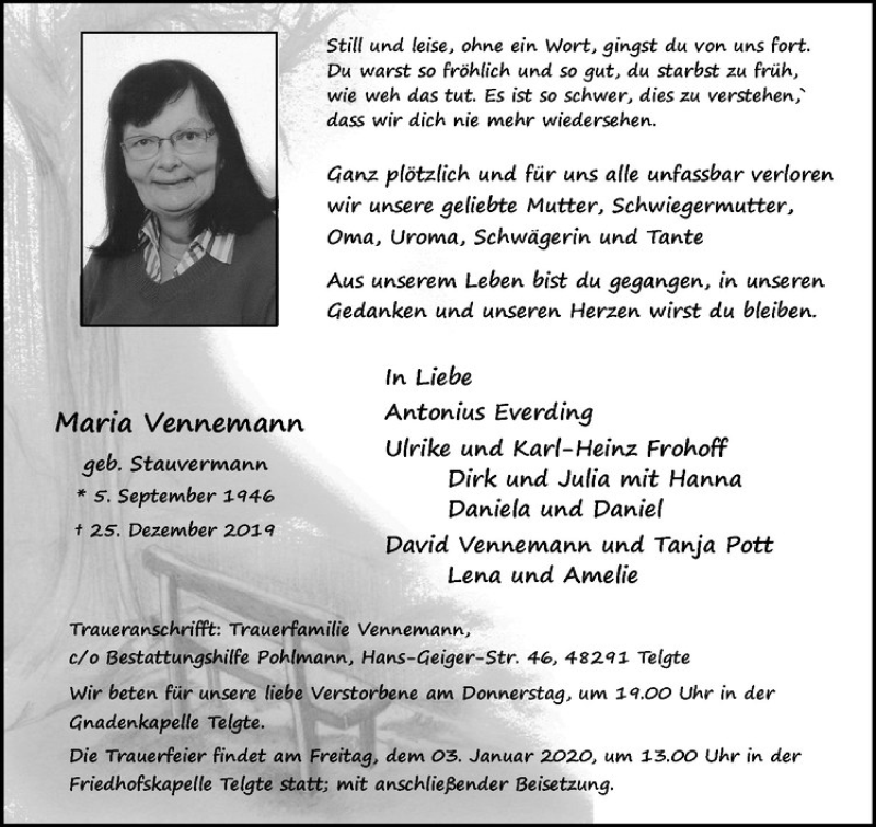 Hier finden Sie alle Traueranzeigen aus der Zeitung, die bisher für Maria Vennnemann erschienen sind. Weitere Traueranzeigen, die in der Zeitung erscheinen, werden hier ebenfalls aufgelistet