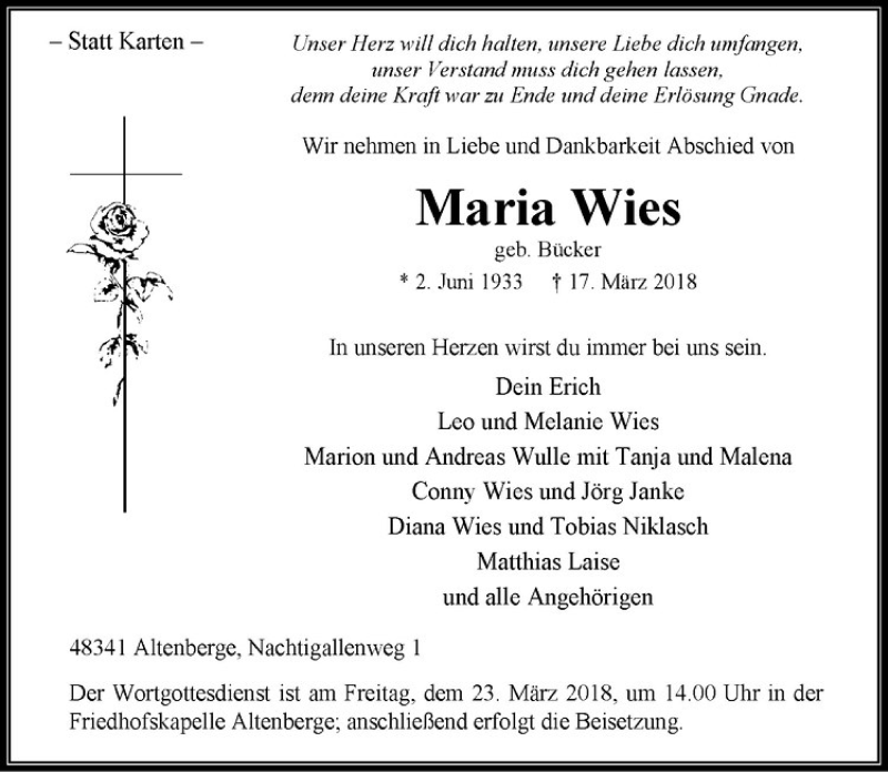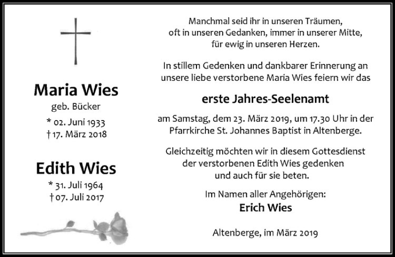 Hier finden Sie alle Traueranzeigen aus der Zeitung, die bisher für Edith Wies erschienen sind. Weitere Traueranzeigen, die in der Zeitung erscheinen, werden hier ebenfalls aufgelistet