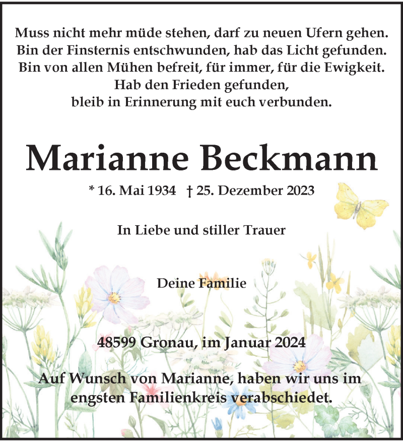 Hier finden Sie alle Traueranzeigen aus der Zeitung, die bisher für Marianne Beckmann erschienen sind. Weitere Traueranzeigen, die in der Zeitung erscheinen, werden hier ebenfalls aufgelistet