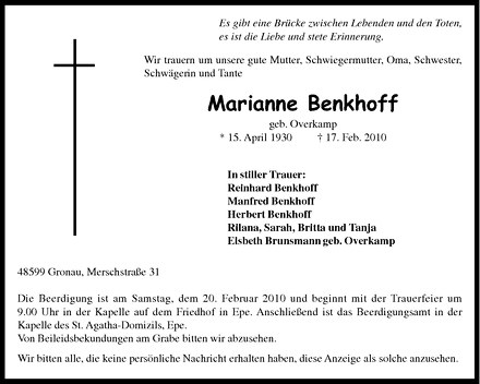 Hier finden Sie alle Traueranzeigen aus der Zeitung, die bisher für Marianne Benkhoff erschienen sind. Weitere Traueranzeigen, die in der Zeitung erscheinen, werden hier ebenfalls aufgelistet