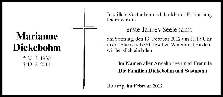 Hier finden Sie alle Traueranzeigen aus der Zeitung, die bisher für Marianne Dickebohm erschienen sind. Weitere Traueranzeigen, die in der Zeitung erscheinen, werden hier ebenfalls aufgelistet