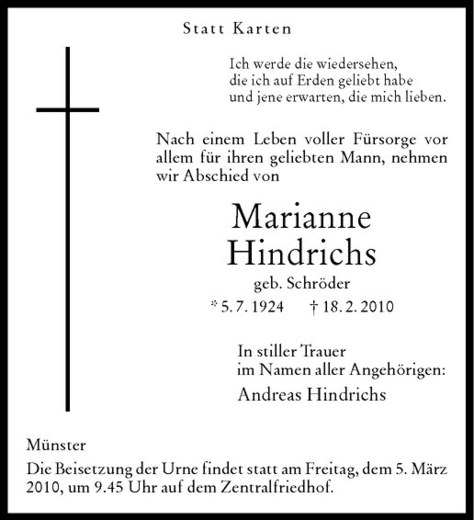 Hier finden Sie alle Traueranzeigen aus der Zeitung, die bisher für Marianne Hindrichs erschienen sind. Weitere Traueranzeigen, die in der Zeitung erscheinen, werden hier ebenfalls aufgelistet