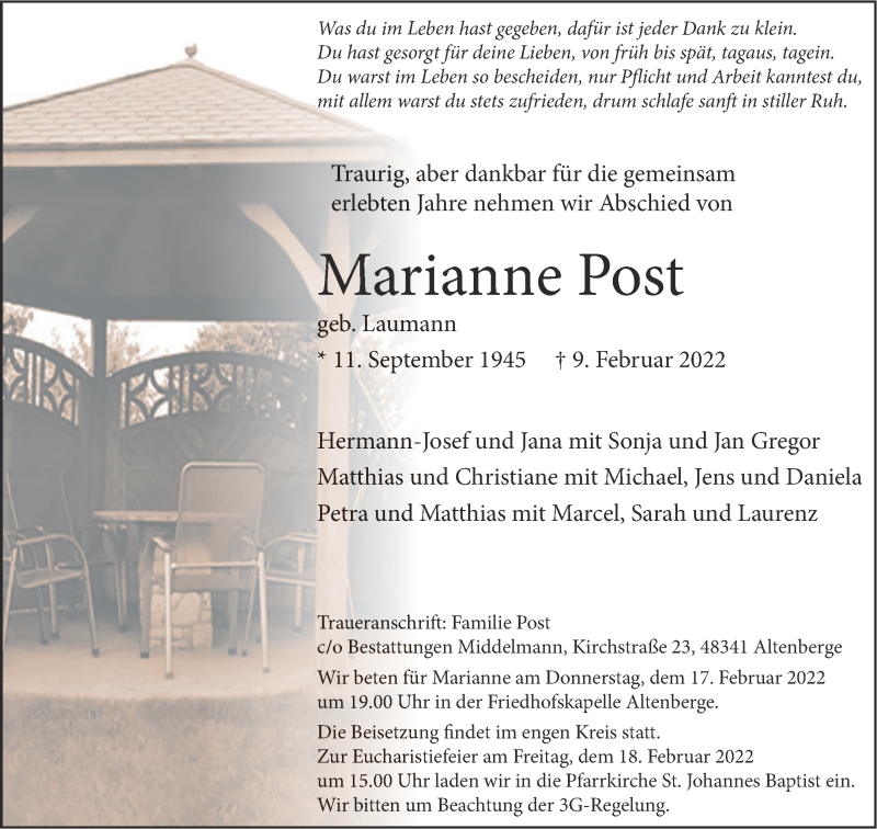 Hier finden Sie alle Traueranzeigen aus der Zeitung, die bisher für Marianne Post erschienen sind. Weitere Traueranzeigen, die in der Zeitung erscheinen, werden hier ebenfalls aufgelistet