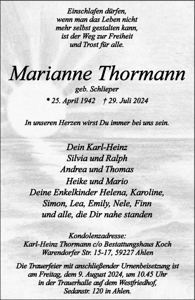 Hier finden Sie alle Traueranzeigen aus der Zeitung, die bisher für Marianne Thormann erschienen sind. Weitere Traueranzeigen, die in der Zeitung erscheinen, werden hier ebenfalls aufgelistet