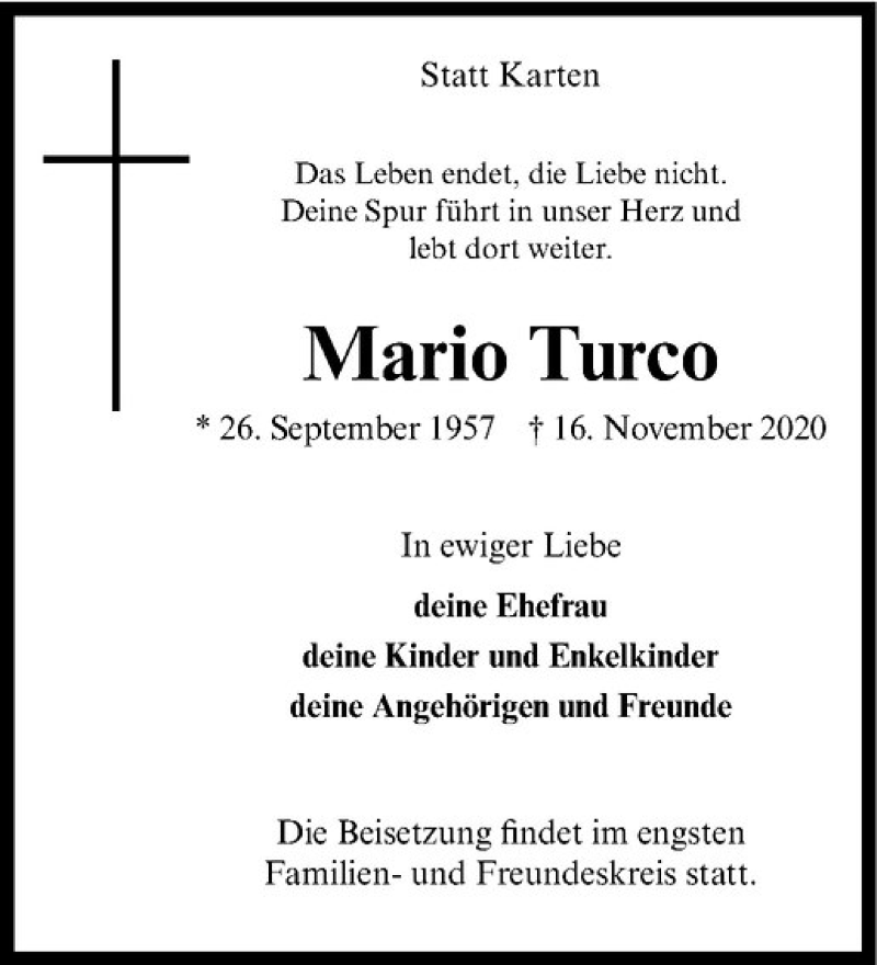 Hier finden Sie alle Traueranzeigen aus der Zeitung, die bisher für Mario Turco erschienen sind. Weitere Traueranzeigen, die in der Zeitung erscheinen, werden hier ebenfalls aufgelistet