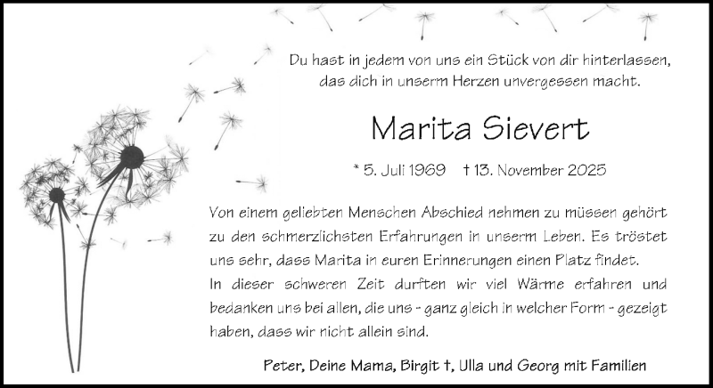 Hier finden Sie alle Traueranzeigen aus der Zeitung, die bisher für Marita Sievert erschienen sind. Weitere Traueranzeigen, die in der Zeitung erscheinen, werden hier ebenfalls aufgelistet