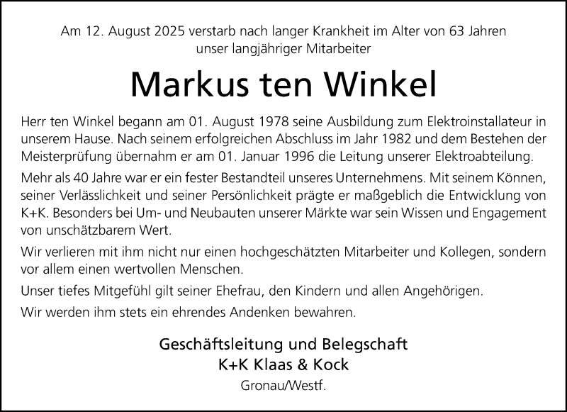 Hier finden Sie alle Traueranzeigen aus der Zeitung, die bisher für Markus ten Winkel erschienen sind. Weitere Traueranzeigen, die in der Zeitung erscheinen, werden hier ebenfalls aufgelistet