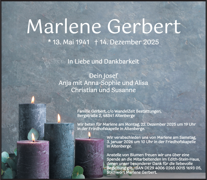 Hier finden Sie alle Traueranzeigen aus der Zeitung, die bisher für Marlene Gerbert erschienen sind. Weitere Traueranzeigen, die in der Zeitung erscheinen, werden hier ebenfalls aufgelistet