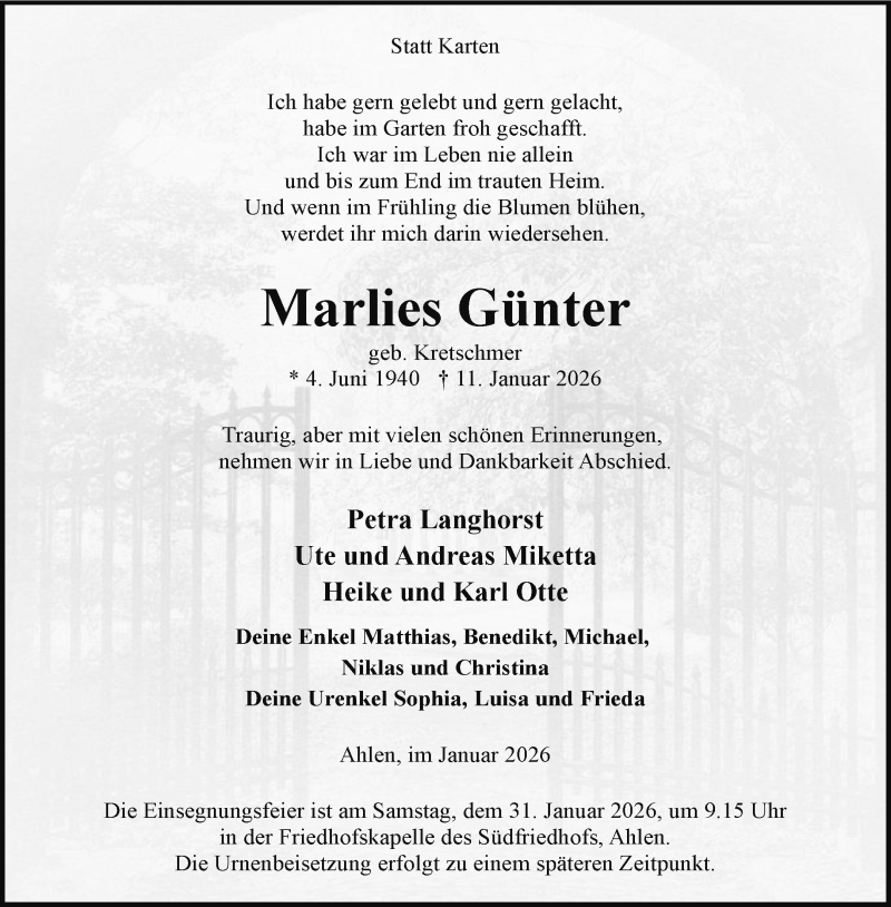 Hier finden Sie alle Traueranzeigen aus der Zeitung, die bisher für Marlies Günter erschienen sind. Weitere Traueranzeigen, die in der Zeitung erscheinen, werden hier ebenfalls aufgelistet