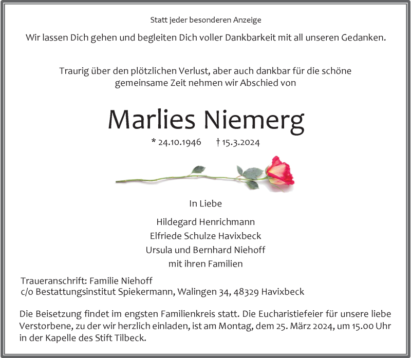 Hier finden Sie alle Traueranzeigen aus der Zeitung, die bisher für Marlies Niemerg erschienen sind. Weitere Traueranzeigen, die in der Zeitung erscheinen, werden hier ebenfalls aufgelistet
