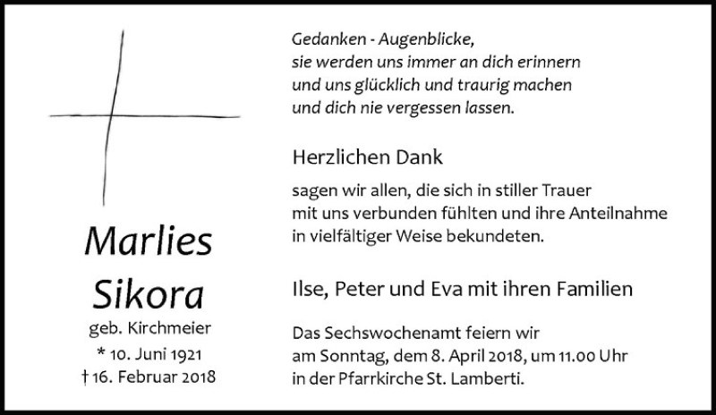 Hier finden Sie alle Traueranzeigen aus der Zeitung, die bisher für Marlies Sikora erschienen sind. Weitere Traueranzeigen, die in der Zeitung erscheinen, werden hier ebenfalls aufgelistet