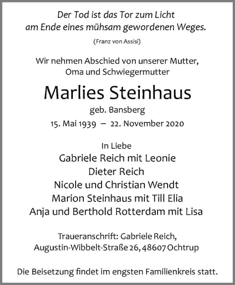 Hier finden Sie alle Traueranzeigen aus der Zeitung, die bisher für Marlies Steinhaus erschienen sind. Weitere Traueranzeigen, die in der Zeitung erscheinen, werden hier ebenfalls aufgelistet