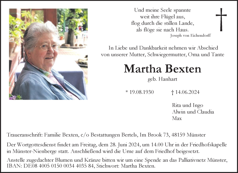 Hier finden Sie alle Traueranzeigen aus der Zeitung, die bisher für Martha Bexten erschienen sind. Weitere Traueranzeigen, die in der Zeitung erscheinen, werden hier ebenfalls aufgelistet