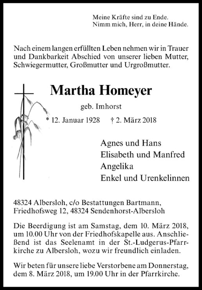 Hier finden Sie alle Traueranzeigen aus der Zeitung, die bisher für Martha Homeyer erschienen sind. Weitere Traueranzeigen, die in der Zeitung erscheinen, werden hier ebenfalls aufgelistet