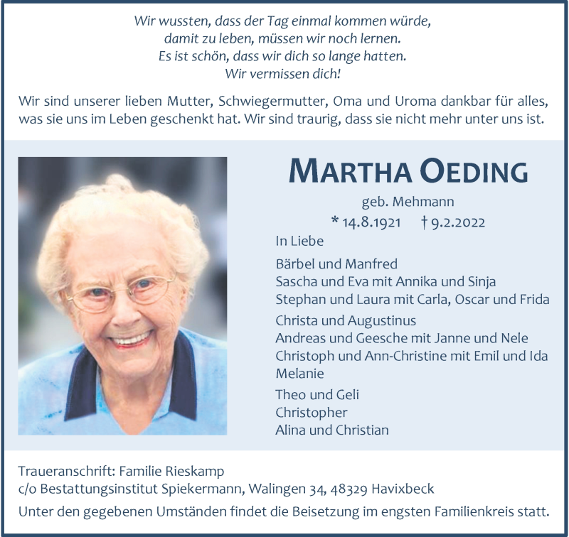 Hier finden Sie alle Traueranzeigen aus der Zeitung, die bisher für Martha Oeding erschienen sind. Weitere Traueranzeigen, die in der Zeitung erscheinen, werden hier ebenfalls aufgelistet