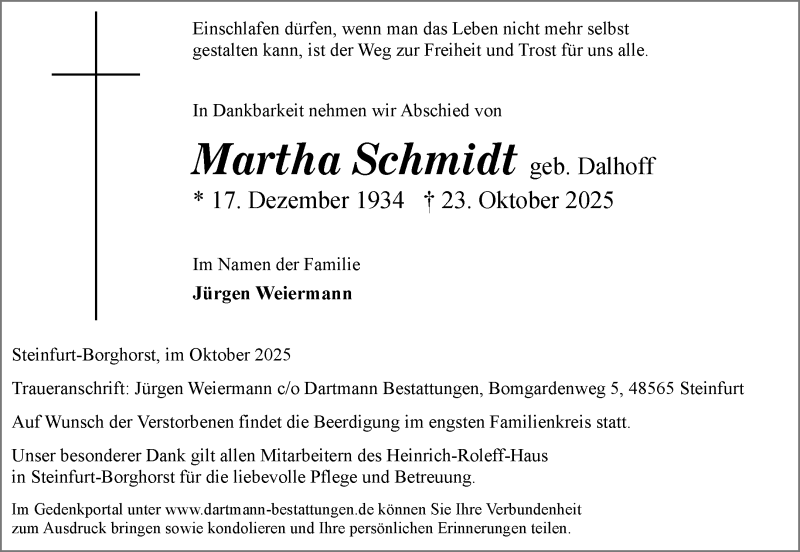 Hier finden Sie alle Traueranzeigen aus der Zeitung, die bisher für Martha Schmidt erschienen sind. Weitere Traueranzeigen, die in der Zeitung erscheinen, werden hier ebenfalls aufgelistet