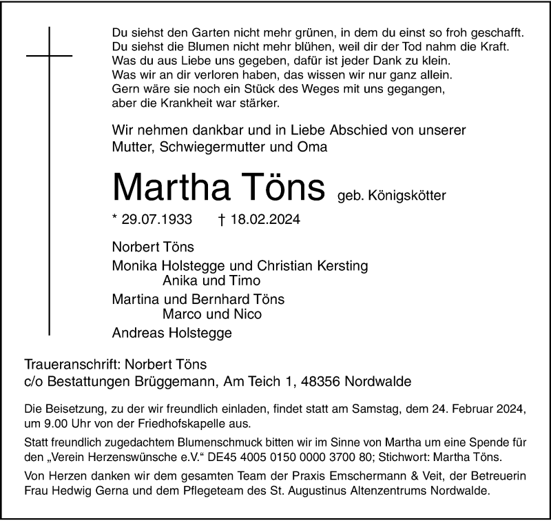 Hier finden Sie alle Traueranzeigen aus der Zeitung, die bisher für Martha Töns erschienen sind. Weitere Traueranzeigen, die in der Zeitung erscheinen, werden hier ebenfalls aufgelistet