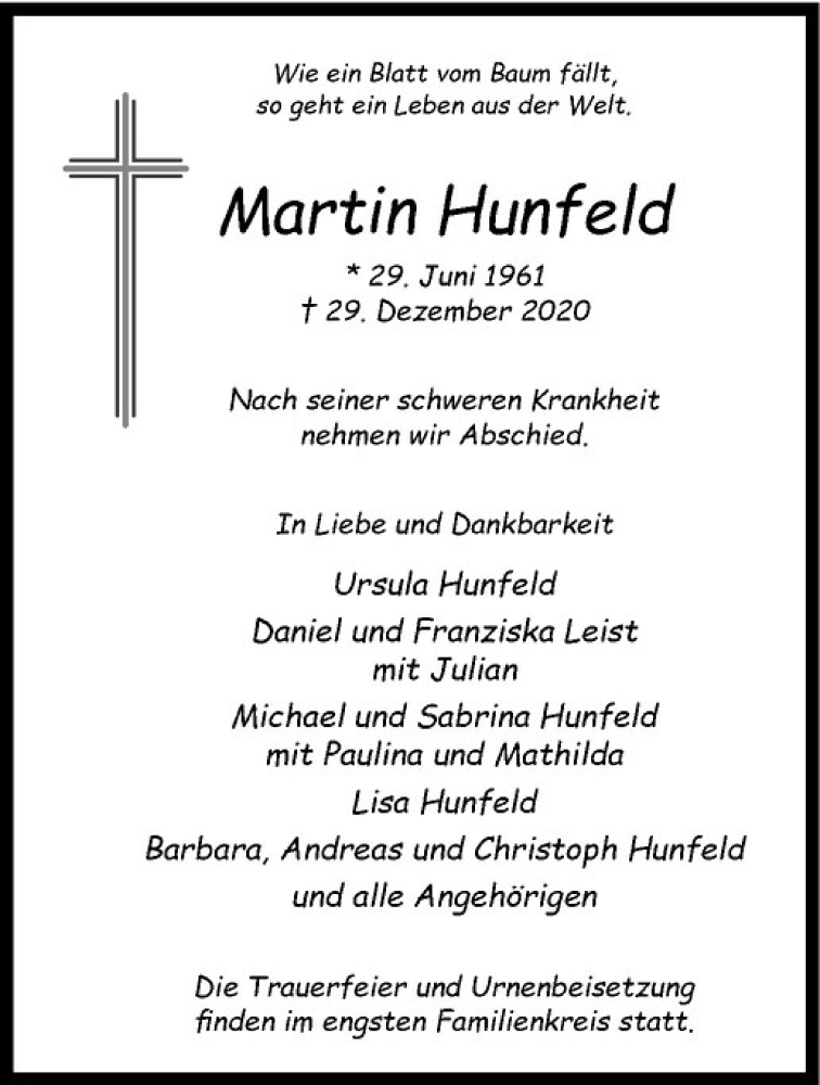 Hier finden Sie alle Traueranzeigen aus der Zeitung, die bisher für Martin Hunfeld erschienen sind. Weitere Traueranzeigen, die in der Zeitung erscheinen, werden hier ebenfalls aufgelistet