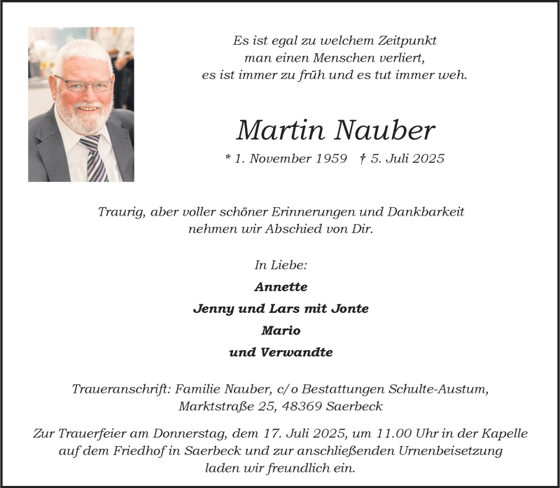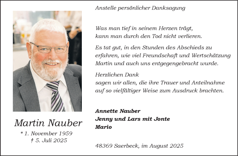 Hier finden Sie alle Traueranzeigen aus der Zeitung, die bisher für Martin Nauber erschienen sind. Weitere Traueranzeigen, die in der Zeitung erscheinen, werden hier ebenfalls aufgelistet