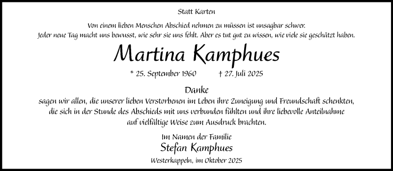 Hier finden Sie alle Traueranzeigen aus der Zeitung, die bisher für Martina Kamphues erschienen sind. Weitere Traueranzeigen, die in der Zeitung erscheinen, werden hier ebenfalls aufgelistet