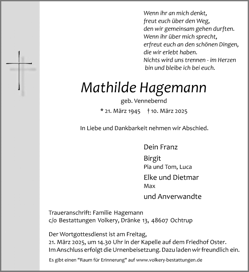 Hier finden Sie alle Traueranzeigen aus der Zeitung, die bisher für Mathilde Hagemann erschienen sind. Weitere Traueranzeigen, die in der Zeitung erscheinen, werden hier ebenfalls aufgelistet
