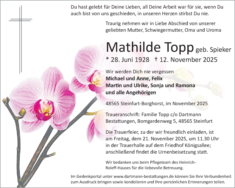 Hier finden Sie alle Traueranzeigen aus der Zeitung, die bisher für Mathilde Topp erschienen sind. Weitere Traueranzeigen, die in der Zeitung erscheinen, werden hier ebenfalls aufgelistet