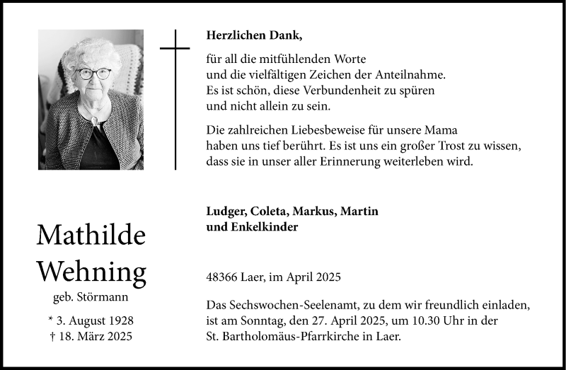 Hier finden Sie alle Traueranzeigen aus der Zeitung, die bisher für Mathilde Wehning erschienen sind. Weitere Traueranzeigen, die in der Zeitung erscheinen, werden hier ebenfalls aufgelistet