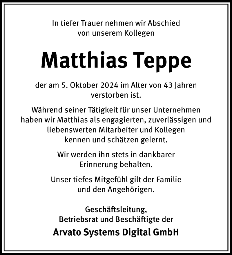 Hier finden Sie alle Traueranzeigen aus der Zeitung, die bisher für Matthias Teppe erschienen sind. Weitere Traueranzeigen, die in der Zeitung erscheinen, werden hier ebenfalls aufgelistet