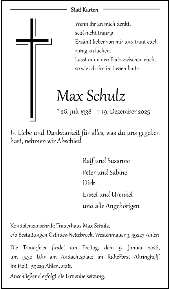 Hier finden Sie alle Traueranzeigen aus der Zeitung, die bisher für Max Schulz erschienen sind. Weitere Traueranzeigen, die in der Zeitung erscheinen, werden hier ebenfalls aufgelistet