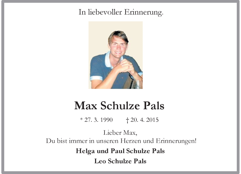 Hier finden Sie alle Traueranzeigen aus der Zeitung, die bisher für Max Schulze Pals erschienen sind. Weitere Traueranzeigen, die in der Zeitung erscheinen, werden hier ebenfalls aufgelistet