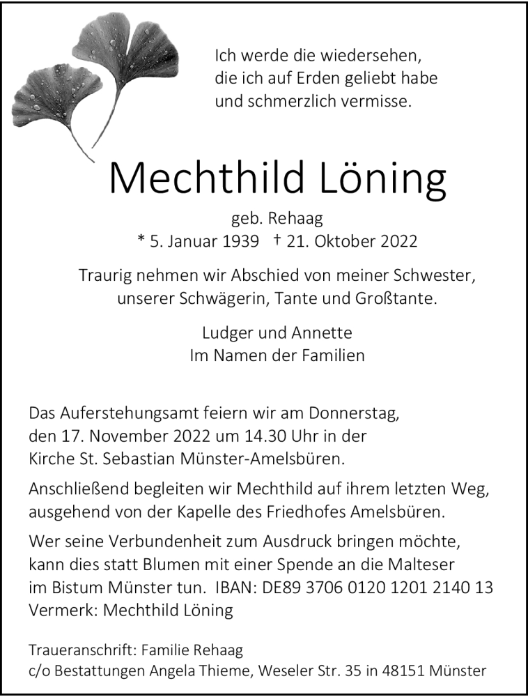 Hier finden Sie alle Traueranzeigen aus der Zeitung, die bisher für Mechthild Löning erschienen sind. Weitere Traueranzeigen, die in der Zeitung erscheinen, werden hier ebenfalls aufgelistet